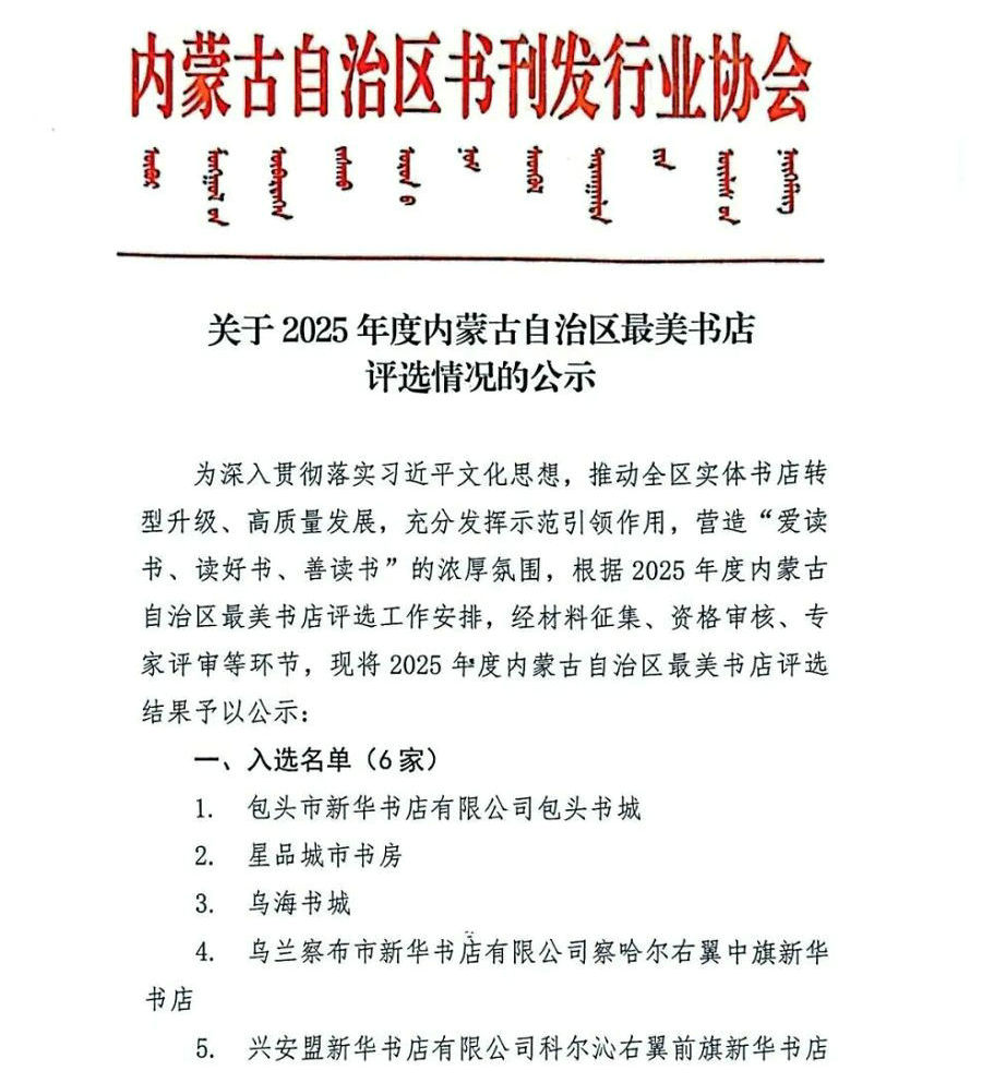為深入貫徹落實(shí)習(xí)近平文化思想,推動(dòng)全區(qū)實(shí)體書店轉(zhuǎn)型升級(jí)、高質(zhì)量發(fā)展,充分發(fā)揮示范引領(lǐng)作用,營造“愛讀書、讀好書、善讀書”的濃厚氛圍,根據(jù)2025年度內(nèi)蒙古自治區(qū)最美書店評(píng)選工作安排,經(jīng)材料征集、資格審核、專家評(píng)審等環(huán)節(jié),現(xiàn)將2025年度內(nèi)蒙古自治區(qū)最美書店評(píng)選結(jié)果予以公示: